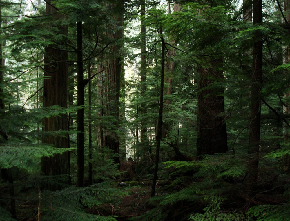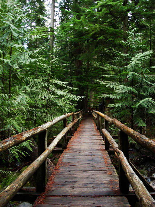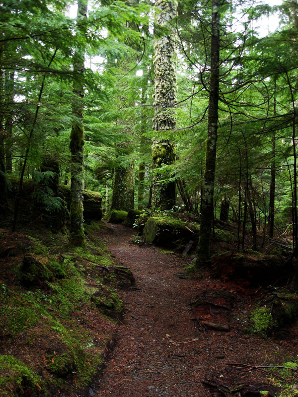It's a fresh, green experience with tall trees of western Hemlocks, Douglas Firs, Red Cedars, Ferns and flowering bushes...depending on the time of year. Moss covers the ground and the trees, including those that have fallen long ago.