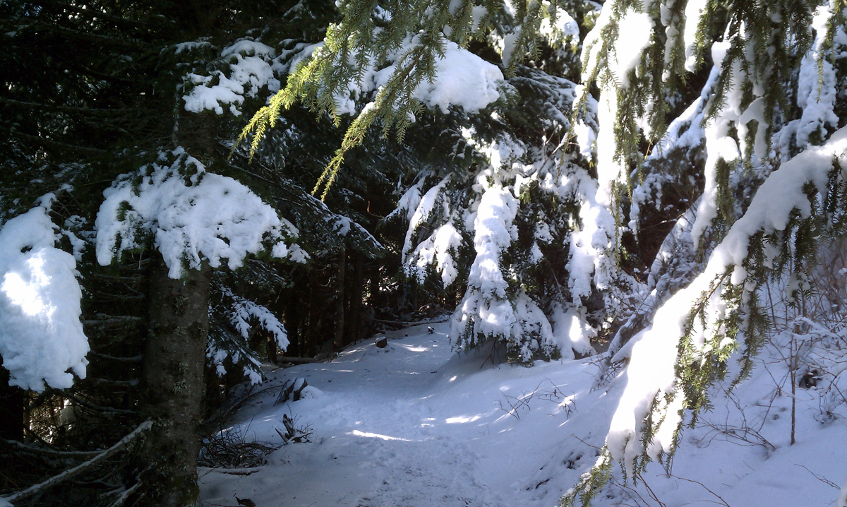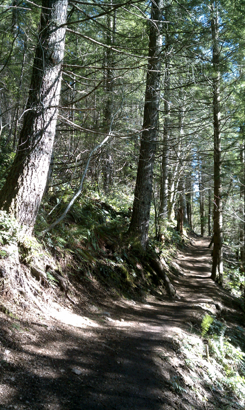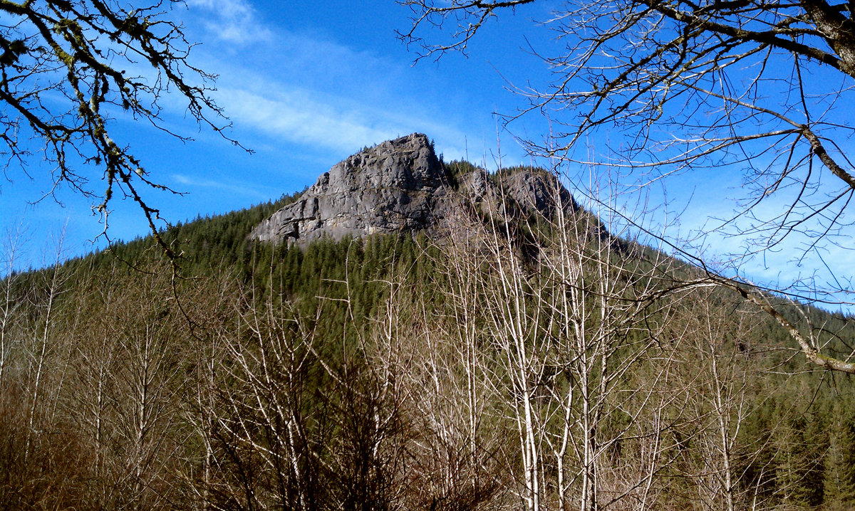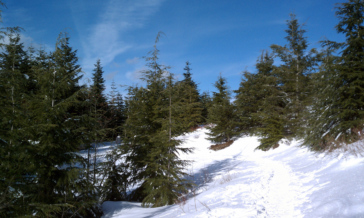 The Rattlesnake Ledge trail was nicely rebuilt in 2003. This trail climbs over 1,000 feet in the first mile and a half as you switchback up the mountain side. Even in winter when the Alders are bare, the forest is green with Hemlocks and Firs, many of which are draped with the ever-present northwest moss, and the ground is covered with ferns.